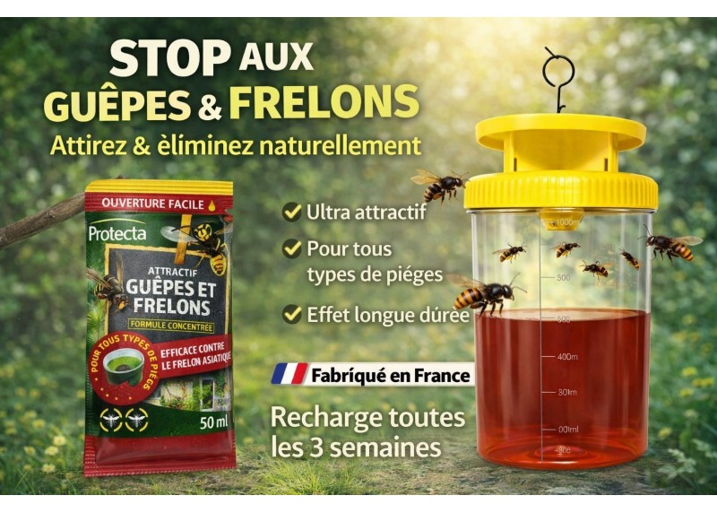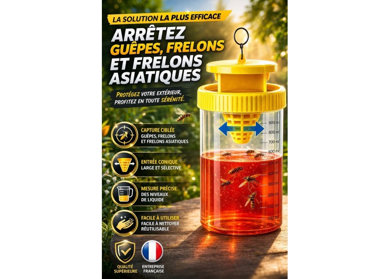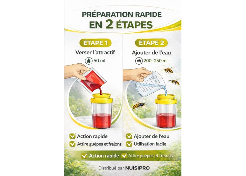 PIÈGE À GUÊPES & FRELON ASIATIQUE EFFICACE Kit complet NUISIPRO avec piège à guêpes réutilisable + attractif 50 ml spécialement formulé pour attirer guêpes et frelons (dont frelon asiatique). Solution idéale pour réduire rapidement la présence autour de votre maison.